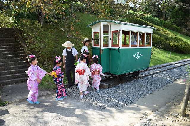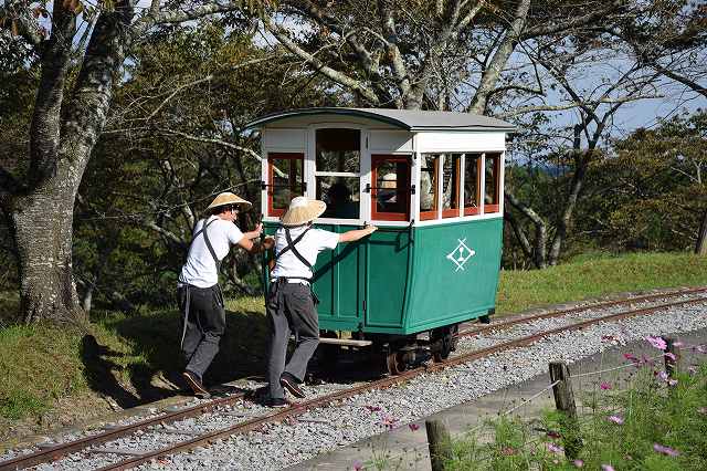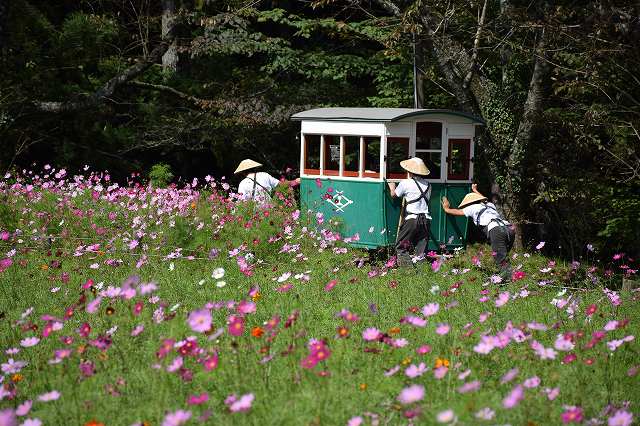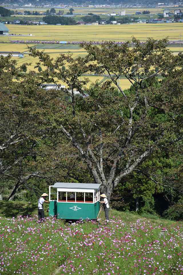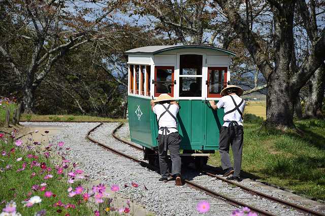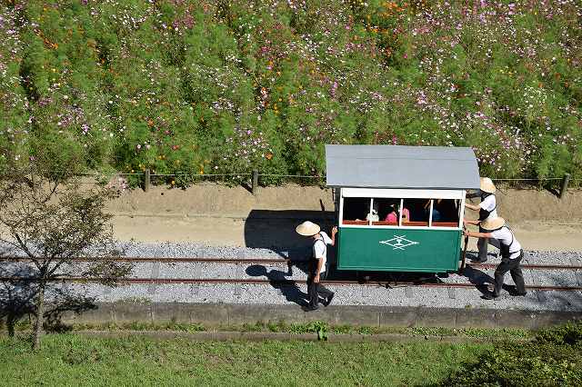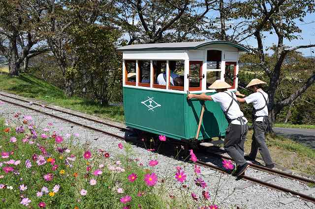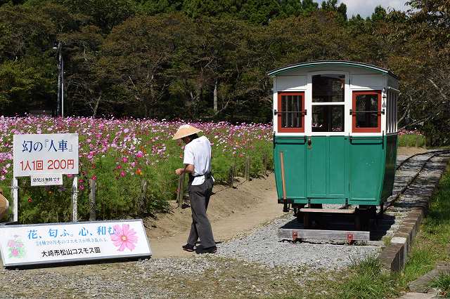 ええっと、松山人車軌道、言いましてな。昔東北線の松山町駅から町の中心部までを結んでいたものを復元したんですわ。で、毎年9月のコスモス祭り期間中に運転するんですな。